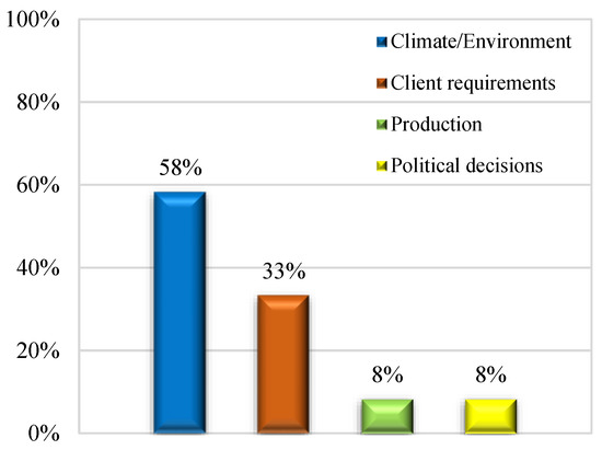 Most of the respondents indicated that they choose frame material individually for each project. They thus did not work with standardized solutions but adapted the frame to the project’s conditions. Several respondents stated that the choice of frame is often made before the contractors are involved in the project. If, on the other hand, you are involved in the project early or you yourself are a client, you have more options. One respondent answered that the workflow of the frame choice varies, while another declared that they always construct with wooden frames. When asked why the respondents choose wood as the frame material in their projects instead of other frame materials, they responded as presented in Figure 1. 58% of the respondents answered that it is because of the sustainability and environmental aspects. One respondent claimed that a great environmental focus is fundamental, and wood is an environmentally superior material. However, 33% of them believed that wood is chosen as the frame material due to the requirements of clients which cannot be affected. Political decisions (8%) and production advantages (8%) were also reasons given by the respondents.
