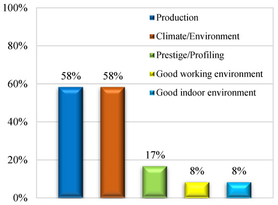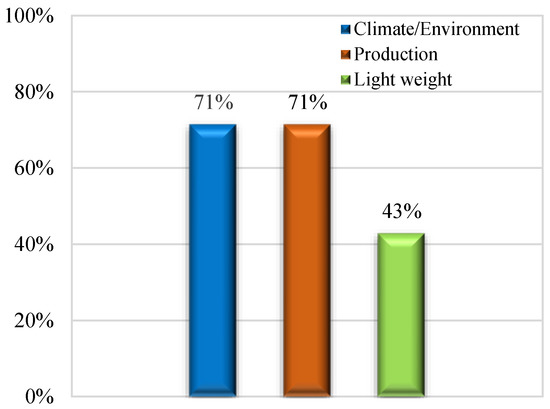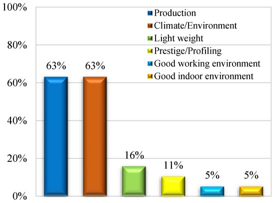 In this section, results from the ERs and UERs are compared and discussed. The comparison of the advantages of using wooden frames stated by the ERs and UERs is reported in Figure 9. As can be seen from the figure, production (63%) and climate or environment (63%) constituted the greatest advantages of using wooden frames. The remaining advantages were the light weight of wood (16%), prestige or profiling (11%), good working environment (5%), and good indoor environment (5%).