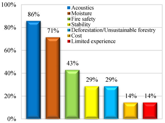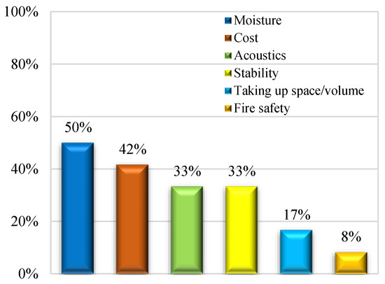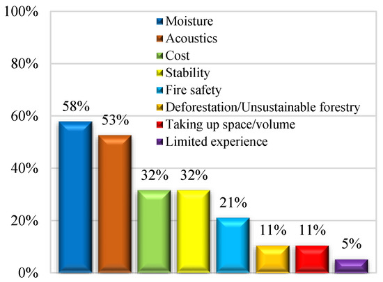 The respondents not only considered the advantages of constructing with wooden frames but believed that there are also certain disadvantages which should be taken into account. Figure 3 shows the proportion of respondents’ answers regarding the disadvantages. The respondents highlighted moisture (50%), cost (42%), acoustics (33%), stability (33%), wood volume (17%), and fire safety (8%) as disadvantages of wooden building projects.