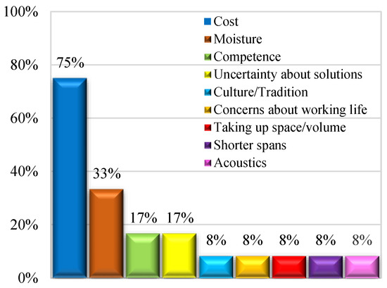 Figure 7 indicates the disadvantages of constructing with wooden frames considered by the UERs. Sound insulation and moisture sensitivity were noticed as major disadvantages by 86% and 71% of the respondents, respectively. One respondent explained that extra measures were required to ensure the sound requirements. Another respondent claimed that it was difficult to protect the material from moisture during the construction period. The same respondent mentioned that there was limited experience (14%) of wood as a frame material, which was considered as a problem. In addition, 29% of the respondents said that wood construction can have negative climate and environmental impacts, as they considered that today’s forestry is not sustainable and leads to reduced biological diversity and large emissions. One of these respondents mentioned that if it is to be constructed with wood, the material must come from sustainable forestry. Furthermore, 43% of the respondents indicated that the fire risk must be evaluated, and the fire requirements become more complicated to solve in a building with a wooden frame. Stability problems were addressed by 29% of the respondents. One of these respondents described that the frame stability deteriorates compared with concrete. This was clarified by another respondent who said that buildings may be too light with a wooden frame and that extra weight may need to be added. Additionally, 14% of the respondents stated that the buildings’ maintenance during their life cycle constitutes an increased cost.