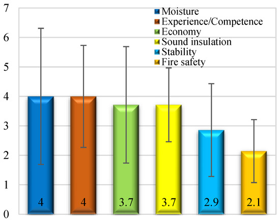 The UERs were finally asked to evaluate six different factors based on how much influence they had on their decision not to construct with wooden frames. The respondents had to give a value from 1–6 on the various factors, where 6 corresponded to the greatest impact. Figure 8 presents the mean values of how the respondents ranked these factors. The results showed that moisture problems and experience or lack of competence were the factors that affected the respondents the most, both with the mean value of 4, but with the standard deviations of ±2.3 and ±1.7, respectively. Other factors were economy, sound insulation, stability or durability, and fire safety, with the mean values of 3.7, 3.7, 2.9, and 2.1, respectively, however, their standard deviations were ±2.0, ±1.3, ±1.6, and ±1.1, respectively.