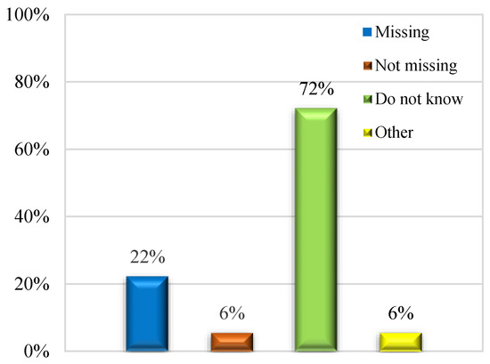 Finally, the ERs and UERs were asked if they felt that newly graduated engineers possessed knowledge in wood construction or if they felt that it was lacking in their education: 36% of the ERs answered as missing, 9% not missing, and 64% had no opinion. However, 86% of the UERs answered that they had no opinion about it. The combined results regarding lack of knowledge of newly graduated engineers in wood construction are compared in Figure 13.