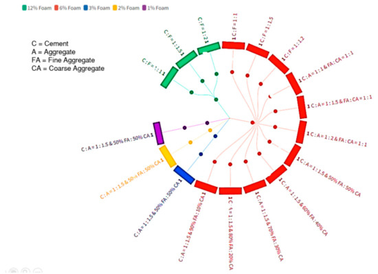 Radial Diagram of Mix Compositions. Figure 2 is a depiction of different mixtures used for the current study. Green indicates 12% foam with different cement-to-sand (c/s) ratios. Red indicates 6% foam with different c/s ratios and Fine aggregate to coarse aggregate ratios. Blue indicates the mix with 3% foam, 50% CA, and 50% FA. Yellow indicates the mixture with 2% foam, 50% CA, and 50% FA. Purple indicates the mix with 1% foam, 50% CA, and 50% FA.