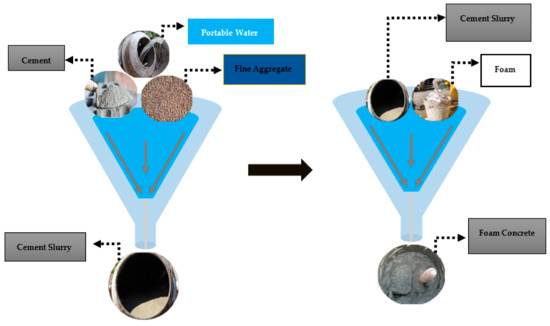A concrete mixer generates FC by mixing foam and cement slurry. The pre-foaming method is adopted to create FC as per IS 2185: 2008 (part 4) [36]. Into the homogeneous mixture of cement slurry made up of Portland cement and fine aggregate, the prefabricated foam will then be poured, and this process of mixing continues until the bubbles have been dispersed uniformly [41]. The FC mixture’s wet density should range within ±100 kg/m3. The preparation of FC and the foam generation process are shown in Figure 3 [42].