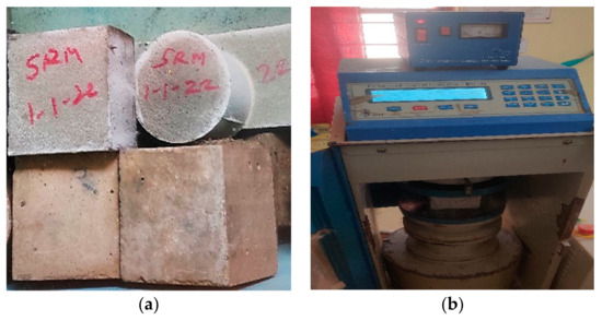 Figure 4. (a) Cube and Cylinder Specimens of FC., (b) Compressive Testing Machine.