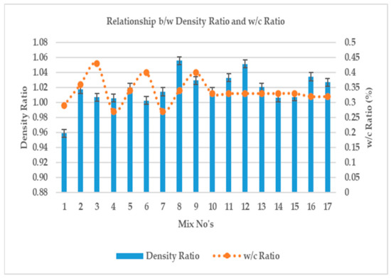 Consistency of the FC mix can be achieved with the proper dosage of the w/c ratio. Variation of the density ratio to the w/c is shown in Figure 6. From the graph, it is observed that most of the mixes achieved a density ratio of unit one. Additionally, it has been found that the density ratio is inversely proportional to foam volume and directly proportional to the w/c ratio.