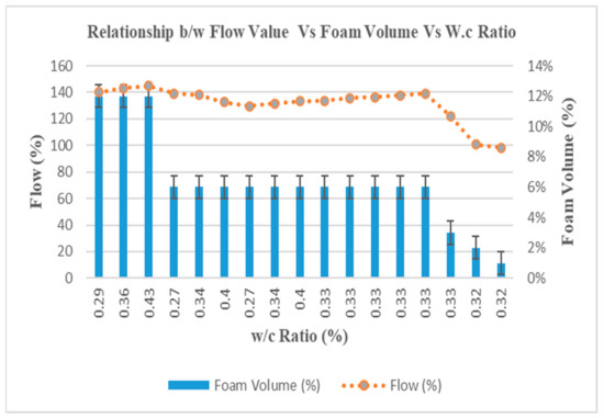Using a typical flow cone, we can quantify the flow rate and hence learn about the flow characteristics of different mixtures [7]. The change in flow behavior of mixes with various w/c ratios and foam volumes has been examined. Figure 7 shows the relationship between the flow value of FC mixes with varying foam volumes and w/c ratios. From the graph, it is observed that the mix with 1% foam volume and 0.32% w/c has a lower flow value of 98.4%. The mix with 12% foam volume has a higher flow value of 140%, which is primarily due to the reduction of stiffness in FC with the increase in foam volume. A mix with a lower w/c ratio and low foam volume is generally found to have a low flow value and vice versa.