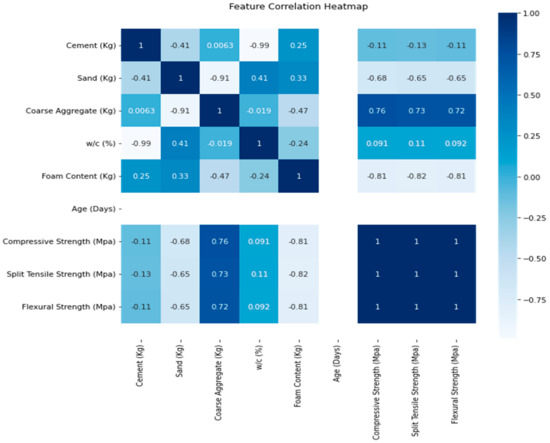 A correlation matrix was drawn between the parameters of the given dataset, and the results are shown in Figure 8. According to the results from the dataset, CS, TS, and FS were highly correlated with coarse aggregate (i.e., 0.76, 0.73, and 0.72, respectively). Moreover, a correlation has been observed between the cement to foam volume (i.e., 0.25), Fine Aggregate (FA) to foam volume (i.e., 0.33), and FA to w/c ratio (i.e., 0.41). Therefore, it can be said that the CS, TS, and FS are highly influenced by the addition of foam and coarse aggregate.