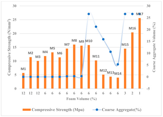 Figure 9 represents the relation between CS, CA, and the w/c ratio. The highest compressive strength for varying batches B1, B2, B3, B4, B5, B6, and B7 were found to be 11.45 N/mm2 (M2), 13.18 N/mm2 (M5), 15.99 N/mm2 (M8), 15.82 N/mm2 (M10), 14.5 N/mm2 (M15), 20.4 N/mm2 (M16), and 25.6 N/mm2 (M17), respectively. Rendering to the findings, an increase in CS of FC was found with the addition of coarse aggregate. From the results, it has been observed that the CS of FC is higher for mixes with low foam volume.