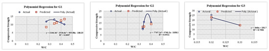 The relationship between the 28-day CS, foam volume, and coarse aggregate is obtained based on the experimental results, where a non-linear curve has been observed in the results. Therefore, a polynomial regression analysis is performed between CS and the w/c ratio, and the results regarding the analysis are displayed in Figure 10 and Table 8. A good correlation is observed, with coefficient of determination (R2) values of 0.98, 0.95, and 0.79 for G1, G2, and G3, respectively. The polynomial regression analysis was carried out by an ANN, which resulted in a stronger correlation with the experimental data, simultaneously producing the lowest errors in terms of its ability to forecast the CS of FC.