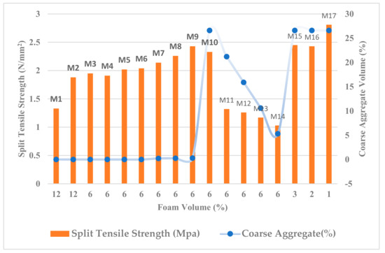 Figure 11. Splitting Tensile Strength vs. Coarse Aggregate vs. Foam Volume of FC.