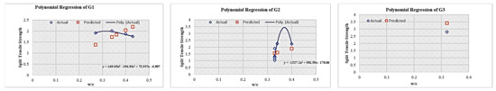 Based on the experimental observations, the relationship between the 28-day TS, foam volume, and coarse aggregate is found to be non-linear. Therefore, a polynomial regression analysis between the CS and the w/c ratio was conducted, and the results of the analysis are shown in Figure 12 and Table 9. A strong correlation has been found, with coefficient of determination R2 values for G1, G2, and G3 of 0.96, 0.93, and 0.99, respectively.