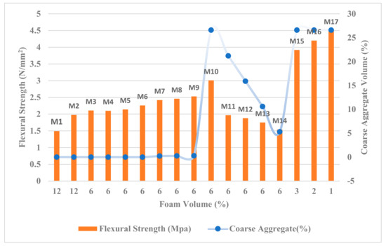 Figure 13. Flexural Strength vs. Coarse Aggregate vs. Foam Volume of FC.