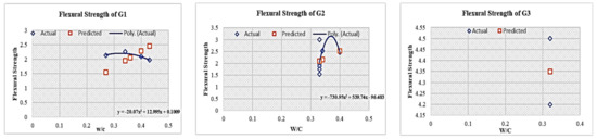 With the help of experimental results, a polynomial regression analysis was performed between the FS and the w/c ratio. The analysis was performed in three groups based on the foam volumes, and the results of the analysis are displayed in Figure 14 and Table 10. From the results, it is observed that the FS and w/c show a great correlation, with R2 values of 0.96, 0.95, and 0.99 for G1, G2, and G3, respectively, and minimum error values were observed for RMSE, MSE, and MAE.
