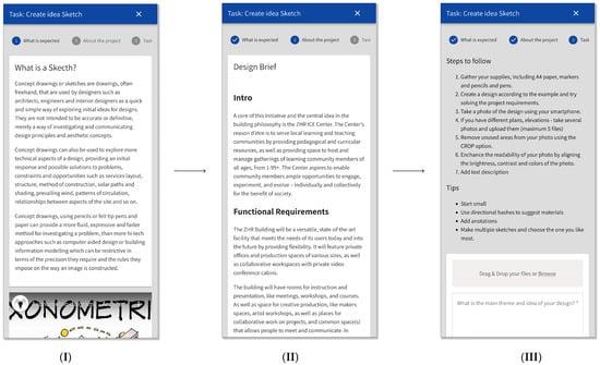 Design task user flow screens (from left to right): (I) The design task goals and expected design artifacts are presented and explained. (II) The design brief is presented to provide the context of the project. (III) The participant is given some technical instructions and can upload the produced artifact files.