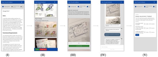 Selection and review tasks user flow screens (from left to right): (I) The design brief is presented to provide the context of the project. (II) New and baseline designs are presented, and the most appealing designs are marked. (III) The marked designs are presented, and only one is selected. (IV) The design is discussed using a chatbot interface that allows for communication in natural language. (V) The chatbot summarizes the conversation into a list of feedback items selected for further development.