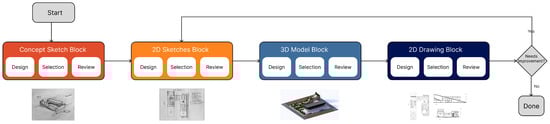 - The concept and 2D sketches are then processed into 3D digital models in the third block.
