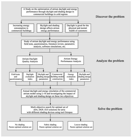 The paper is focused on optimizing the design of atrium skylight and shading (SAS) parameters for commercial buildings in cold zones in China and conducting a multi-objective optimization of atrium daylight, visual comfort, and energy performance. Using field tests, questionnaires, literature searching, and software simulations, we found the existing light environment problems of typical commercial atriums in cold regions and investigated the energy consumption structure of commercial atriums by using energy simulation software. Finally, we obtained the optimal Pareto front solution set for daylight, visual comfort, and energy performance under different shading types. The detailed technical route of the study is shown in Figure 2.