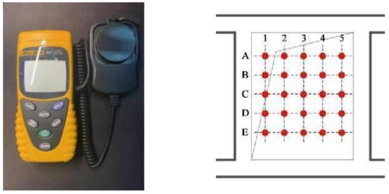 The test in question is the atrium in a commercial building in Jinan, China, which is around 252 m long, 117 m wide, and 30 m tall with 5 floors. there are three four-way encased atriums within the shopping center, and the atrium’s arranged shape is almost rectangular, 45 m long and 36 m wide. the genuine photo and arranged graph of the atrium appear in Figure 3 concurring with the “Method of daylighting measurements, GB/T5699 Beijing: Standards Press of China” The test time was 6 January 2022, from 10:00 a.m. to 16:00 p.m. The fully cloudy weather near the winter solstice was chosen to measure the most unfavorable conditions of daylight in the atrium and to provide data to support daylight optimization later on. The climate was fully cloudy, and the test instrument was the FLUKE-941 illuminance meter, which is small, simple to carry, and conducive to hand-held estimation and real-time recording of illuminance values at estimation focuses. The test was done in the atrium along the length and width of the direction of the uniform arrangement of measurement points. The measurement point spacing was about 8 m, we set five measurement points according to the shopping mall indoor boundaries, which are about 8 m, along the atrium axis direction to generate five horizontal and five longitudinal test sections. The measurement from the ground is 0.75 m high on the horizontal surface as a reference plane, as shown in Figure 4.