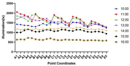 After the test, the detailed measurement data are shown in Figure 5 and Table 2. From the results, it can be seen that the normal indoor illuminance from 11:00 to 13:00 is high, and after 13:00 shows a gradual decline. After 15:00, the illuminance is close to 1000 lx or less, which must be supplemented by manufactured lighting. According to Figure 5, the illuminance distribution of the coordinates before 14:00 has obvious directionality, and the illuminance of the coordinates on the west side of the plane are higher than that of the coordinates on the east side.