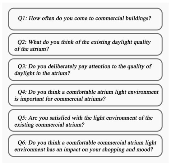 A questionnaire survey on atrium daylight quality has been conducted in a test commercial building atrium. The questions are related to the subjective perception of the daylight environment of the commercial atrium. Six representative questions were chosen, and each question was divided into five levels according to its degree, with levels one to five being defined as not at all, less, average, more, and fully. The questionnaire survey was conducted from 6–8 January 2022, and 224 valid questionnaires were received from randomly selected customers in the indoor atrium and entrance hall, with the questions as Figure 6.