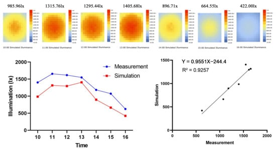 The atrium model is simulated for daylight, glare, and energy consumption using the Ladybug + Honeybee (L + H) plug-in, with L + H’s built-in EnergyPlus, Dayism, and Radiance as simulation tools. The demonstration is, at that point, simulated for brightening, and the relationship is confirmed with the measured information to decide the unwavering quality of the model’s daylight simulation. The results are in Figure 9. From the figure, it can be seen that the simulated atrium illuminance values are for the most part lower than the measured atrium, but the curve fit with time is high, R² = 0.9257, and the correlation analysis results show a significant correlation, which can prove the reliability of the baseline model and pass the daylight simulation verification. (The generally low simulated atrium illuminance values may be due to the dense grid calculated in the simulation and the test points spread all over the atrium plane. However, the actual measurement was only conducted in the center of the atrium where the quality of daylight is good, and the lower illuminance at the edge of the atrium was not counted in the measurement data, so the average illuminance obtained was significantly higher than the simulated illuminance data).