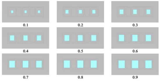 The other part is the shading design parameters. The no-shading design means that there is no shading device on the skylight, so there is no design parameter. Fabric shading refers to the use of transparent materials such as fabrics and roller blinds as shading devices. The visible light transmittance (FV) of materials for fabric shading and the fabric shading coverage (FC) have been selected as research variables in this study. Louver shading is the installation of louvered roller blinds on skylights as shading devices. Usually, the use of louvers can be adjusted in position and tilt point agreeing to the user’s inclination. Still, as a shading device for skylights, the state of the louvers can be ignored for a long time and lead to invariance [15,41]. The louvers’ sizes (LS) and the louvers’ inclination (LI) have been selected as the study parameters. The detailed study parameters are taken in the range shown in Table 6, and the LS is divided into five categories of sizes, which are 50 mm, 75 mm, 100 mm, 125 mm, and 150 mm.