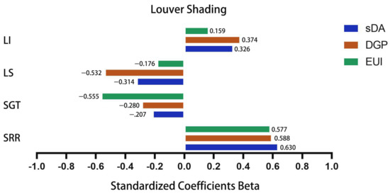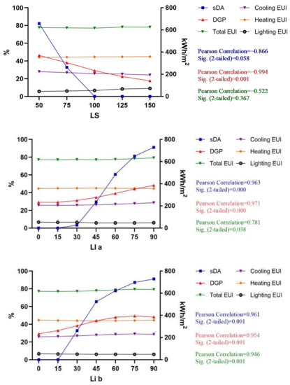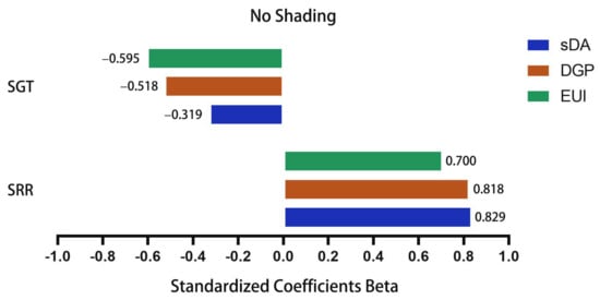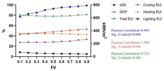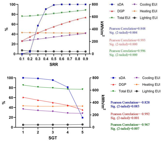 The results show that, for the SRR parameter variables under no shading conditions, sDA and DGP both show a significant positive correlation; the Cooling EUI increases with increasing SRR; the Heating and Lighting EUI decreases with increasing SRR; total EUI and SRR are showing significant positive correlation.