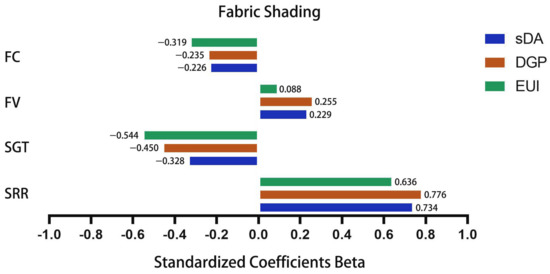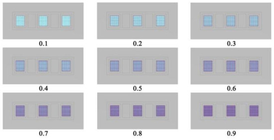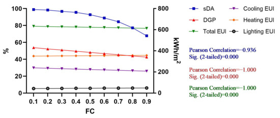 The Fabric Visible transmittance (FV) parameter variable is set in the range of 0.10–0.90, and the Fabric coverage (FC) parameter variable is set in the range of 0.10–0.90, as shown in Table 6. As shown in Figure 13, the working conditions of 0.1–0.9 FV as well as 0.1–0.9 FC, have been simulated separately, and the performance results obtained are shown in Figure 14.