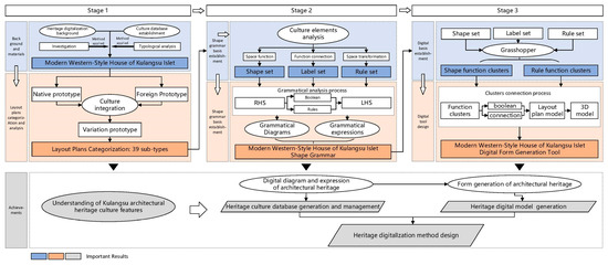 This study starts with the typological categorization described above. First, the main layout plans of modern Western-style houses on Kulangsu Islet are based on native dwellings and foreign housing prototypes. Due to the limited number of these two prototypes, this paper first analyzes shape grammar in a detailed manner for their functions based on the following steps (Figure 4).