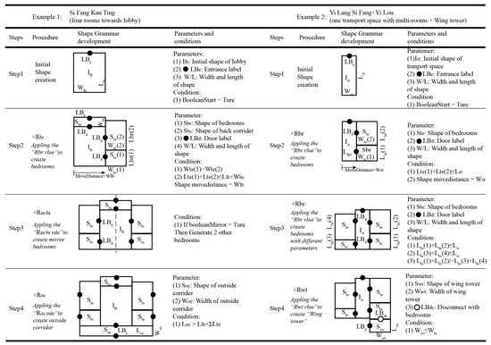 Another example of the shape grammar generation is the layout plan influenced by foreign cultures. One of the most representative forms is called “one transport space with multi-rooms”, which is characterized by a long corridor in the direction of the depth. Its shape grammar is built in a similar way to the native style described above. In the construction of the shape grammar of “one transport space with multi-rooms”, the initial shape (I) of the grammar is first replaced by the lobby with the transportation corridor (Ist). The structure is derived from the traditional Western form of spatial composition and the use of transport space as a central location to organize the functions [65]. The length and width of the transport space are defined as Wst and Lst. With the traffic corridor as the center, the rooms are arranged around the sides, similar to the traditional style. Referring to the native-prototype layout rules, Rn1 and Rn2, the rules Rf1-Rf4 can be established to represent “one transport space with two rooms”, “one transport space with four rooms”, “one transport space with six rooms””, and one transport space with eight rooms”, respectively. The diagram Figure 4 shows 2 typical shape grammar generation processes of “four rooms toward lobby” and “one transport space with multi-rooms + Wing tower” step by step.