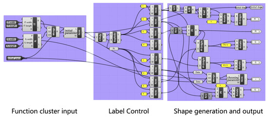 Rule sets are the key element in shape grammar [70]. The focus of the digitization of shape grammar is to programmatically transform the rules after rational generalization. The overall digitization procedure consists of (1) building the set of shapes (S) and rules (R). (2) Building function clusters of shapes (S) and rules (R) based on the shape and math modules in GH and using the cluster function. For simpler transformations, the changes are implemented through regular modules rather than function clusters. (3) Achieving the fast generation of the layout plan model by module connection of each function cluster with the rules. (4) Adding the necessary façade materials, such as walls, columns, windows, and roofs, to create a model group of modern Western-style houses on Kulangsu Islet.