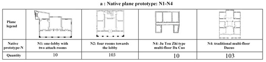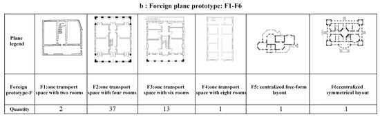 This study collects and analyzes layout plans for the modern Western-style houses on Kulangsu Islet based on the multi-cultural context mentioned above. A total of 313-floor plan samples of modern Western-style Kulangsu houses were collected in the study from other studies and documents provided by the Kulangsu administration [24,64,65]. This study categorizes the 313 planar prototypes into 3 types. For example, the most important references are the core spaces of the houses, such as those centered on the lobby and those centered on the transport space. Analyzed by the cultural background, the position and function of center lobbies in these chosen houses are similar to the center courtyard of native “Minnan Style” dwellings, which shows the strong connection between these modern houses and original native buildings. At the same time, houses with transport space as the core are more inclined to the prototypes of foreign Southern and Western architecture. In this way, it is possible to trace the original prototype of other spaces in these houses, such as corridors, rooms, verandas, etc. By referring to the typical layout characteristics of native cultural buildings and western buildings, this study categorizes the layout plans and identifies the spatial connections that are similar to the space and function, and subdivides the above three types of buildings into 39 sub-types. For example, “one-lobby with two attached rooms” under the native plan type is a typical category of buildings reflecting the characteristics of a native dwelling layout.
