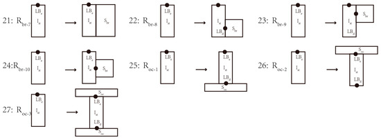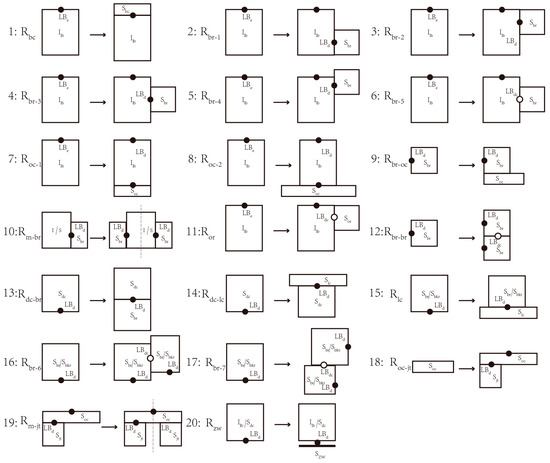 In the native prototype, this study starts to form an example of grammar transformation for the planar prototype called “four rooms towards lobby”, which is spatially regular and symmetrical. In the traditional layout in Minnan Dacuo, the lobby is often arranged in the core area of the building due to the emphasis of the traditional southern Chinese culture on the core gathering space [24,65]. In this case, the main lobby is a good initial shape to generate shape grammar. As one of the I sets of shape grammar, the lobby is the starting element of the layout plan generation system, with the length (Llb) and width (Wlb) as the basic parameters and the location of the entrance as the label of the initial shape (Le) to determine the direction of the space. In the first step of transformation, a transport space at the back of the lobby is selected. This type of space is called Hou Xuan, which means the back corridor in Minnan Dacuo. In Western-style houses, it is transformed into an inner corridor or staircase. Since it usually has the same width as the lobby, only its depth is controlled, with Wbc as the parameter. The transformation rule to add the Hou Xuan function is expressed as a pattern α → β, and the expression can be described as a function change [38,46,59], forming the first rule, that is, Rbc and the generated shape is the one of Hou Xuan in the set S.