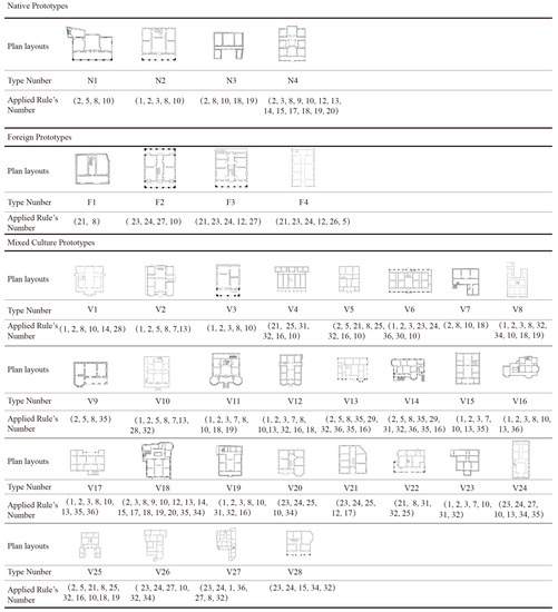One of the important aims of shape grammar is to create sets of shape and rule grammar. Based on the above analysis of the prototypes of the two native types and the four foreign types, the grammar set is expressed as: