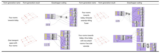 One of the cores of shape grammar is the process of transforming figurative forms into logical reasoning about abstract forms, quite similar to the logic of writing computer programs. In this context, shape grammar started to be applied to the analysis and generation of digital models. The studies cover scales of city, architecture, and landscape, while the research on city scale focuses on urban plots, roads, interfaces, and other content, as well as parameters such as distances, widths, and angles of urban blocks, and finally forms software or tools to guide urban design [48,49,50,51,52]. With similar analytical logic in architecture and traditional architectural diagramming and semantic analysis, shape grammar is a method of abstract diagramming. Most of the studies focus on the analysis of the planes as well as the generation of functional arrangements. Researchers have made an analysis of plan functions with the help of computer tools. For example, Slusarczyk created his own software that combines a multiagent system with shape grammar [53], Aksamija and Yue studied plane generation using Sketchup as a platform [54], Eloy and Duarte studied shape grammar for the reorganization of residential buildings and generated a computer model [55], Dincer and Cagdas created a method for the arrangement of 3D functions of residential buildings using 3Ds max software based on the shape grammar principles in 2014 [56], and Kwiecinski and Santos designed a tool for the automated generation of light wood frame building layouts using computers and shape grammar [57]. Although different software has different characteristics in the translation of shape grammar into computer logic, they share the same thematic purpose, that is, to form a relatively systematic digital modeling procedure based on the basic model generation rules of computer software. It lays a foundation for the development of modular programming of shape grammar. Typical representatives are BIM technology and visual graphical modeling technology. BIM technology focuses on modularity, standardization, and efficiency. It usually defines rules for all types of building spaces using shape grammar and applies them to BIM software to take advantage of the standardization and modularity of BIM software for the quick formation of models [58,59,60]. Visual graphical modeling technologies are represented by software tools such as Grasshopper, which substantially reduce the difficulty in computer programming and modeling for architects. However, there are few cases using shape grammar. For example, Xiong conducted a model generation study on Chinese drum tower structures using shape grammar and the Grasshopper tool in 2013 [61], Quaresma performed analysis and model generation for Sant’ Andrea church based on shape grammar in Grasshopper in 2018 [62], and Stouffs further explored shape grammar on parametric transformation and applied it to a simple case in Grasshopper in 2019 [63]. Visual programming and modeling tools have the advantages of convenience and ease of use, scalability, and customizability. In this paper, Grasshopper is chosen as the digital modeling platform to generate models with the logic of shape grammar.