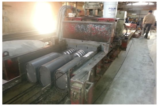 HCS are efficient precast structural elements as they combine the benefits of prestressing and light self-weight. They have high mechanical concrete properties as they are fabricated under controlled conditions in precast plants. HCS are reinforced in the longitudinal direction only using prestressed strands. Therefore, the prestressed strands serve as the primary reinforcement and are installed and pulled prior to placing the concrete. The units are produced on casting tensioning beds by means of either dry (extrusion) casting or wet casting. In the dry method, a very low slump concrete is extruded through a machine. The voids are created by augers or tubes and the concrete is compacted around the cores [2]. Figure 2 shows an extruding machine associated with tubes for creating the voids. On the other hand, the wet method uses normal slump concrete. Stationary, fixed forms, or slip forms that move with the machine create the sides of the slabs. In this method, pneumatic tubes are typically used for creating voids. After hardening the concrete, the ends of the strands are released and the long slab is saw-cut into units of the desired length. The extrusion method is the commonly used manufacturing technique of HCS. That technique prevents any other reinforcing steel to be added either in the longitudinal or lateral direction. Therefore, the shear strength of the units is contributed by concrete only. For this reason, concrete quality must be constant, controlled, and certified at all stages of production [1].