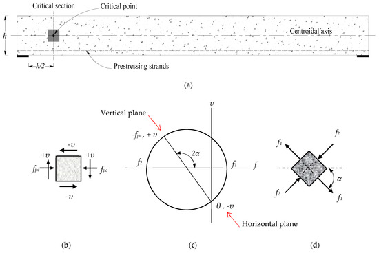 The failure due to web shear cracking generally occurs in prestressed HCS near the support where the slab is uncracked in bending. Therefore, flexural stresses, shear stresses, and principal stresses resulting from their combined action can be determined from the principles of classical mechanics and Mohr’s circle of stress. With reference to Figure 3a, a small element located at the centroidal axis at a section located near the support will be subjected to shear stresses v acting on the vertical faces. These shear stresses will be counteracted by shear stresses of the same magnitude on the horizontal faces to satisfy the equilibrium of the element. The element will also be subjected to horizontal compressive stress fpc due to the prestressing force, as shown in Figure 3b. Then, Mohr’s circle can be constructed to find the principal stresses, as shown in Figure 3c,d. The principal tensile stress f1 can be represented as follows: