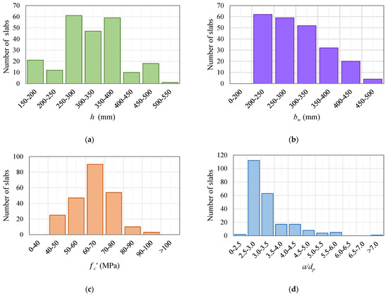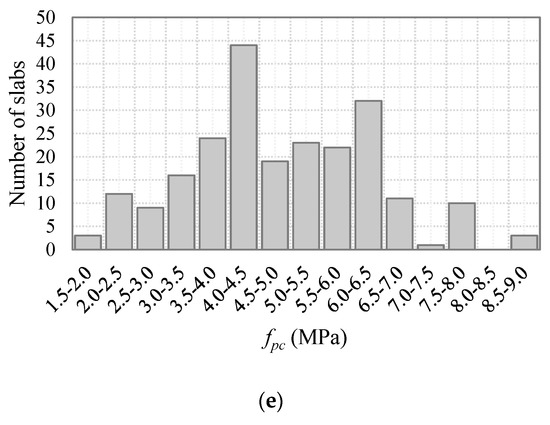 A relatively large database was collected from previous investigations as part of this study for the purpose of assessing the validity of the above design procedures. The database included 229 prestressed HCS test results from 19 different studies [4,5,8,9,13,17,18,28,29,30,31,32,33,34,35,36,37,38,39]. The criteria adopted during collecting the database are (1) no issues or problems reported during testing the HCS; (2) no excessive initial end slip of prestressing strands reported for the slab; (3) all slabs failed explicitly in the web shear; (4) all slabs were simply supported and were tested under the line loading system over the entire width of the slab; and (5) the shear span to depth ratio, a/dp, for all slabs was larger than 2.5. The database had a broad range of design parameters. The thickness of the slabs, h, ranged from 155 to 503 mm while the web width, bw, of the slabs ranged from 215 to 495 mm. The concrete compressive strength, , ranged from 41.4 to 95.8 Mpa, the shear span to depth ratio, a/dp, ranged from 2.5 to 7.1, and the compressive stress fpc at the centroidal axis of the cross section due to fully effective prestressing force ranged from 1.84 to 8.83 MPa. These material and geometrical properties of the slabs represent the mean and nominal values, respectively. The distributions of these key design parameters of the HCS in the database are presented in Figure 4, whereas Table 1 gives relevant details of the slabs in the database. For each range in the figure, the number of specimens is that of specimens greater than the lower limit of the range up to and including the upper limit of the range. It should be pointed out that the details of the HCS of Hawkins and Ghosh [9] are reported in the study by Palmer and Schultz [12]. Additionally, the details of the HCS of TNO [37], Masini [38], and the University of L’Aquila [39] are reported in the study by Bertagnoli and Mancini [40].