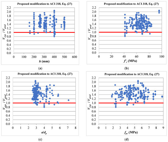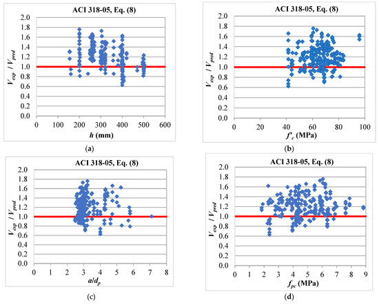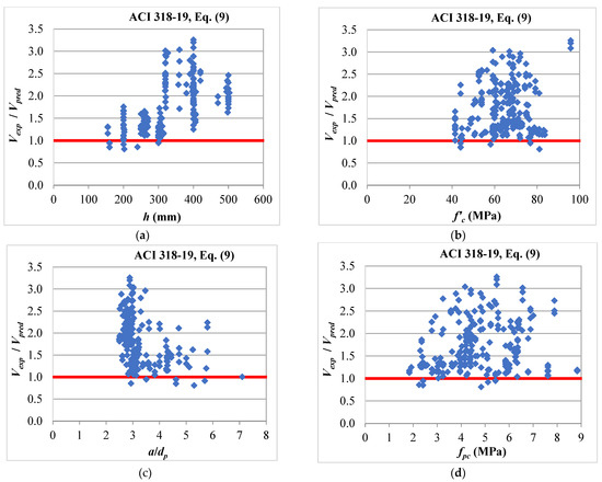 Predictions of Equation (27) against (a) total thickness, (b) concrete compressive strength, (c) shear span to depth ratio, and (d) compressive stress due to the fully effective prestressing force.