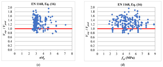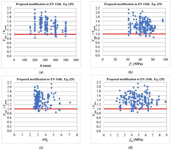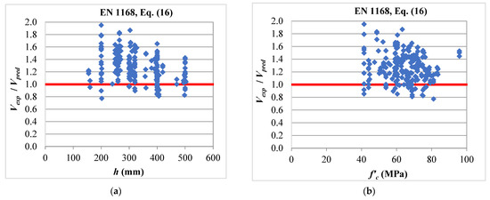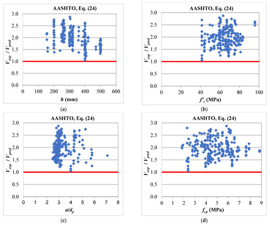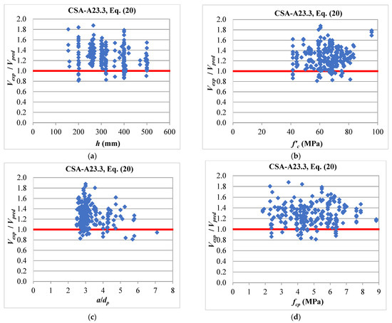 Table 2 indicates reasonable predictions for the 2005 version of the ACI 318 code [10], Equation (8), as the average ratio of Vexp/Vpred being 1.2 with a COV of 18%. However, the method provided 20% of the predictions on the unconservative side. Figure 5 presents the performance of the method against the design variables. Figure 5a indicates that the predictions of Equation (8) are affected by the thickness, h, of the HCS. It can be seen that there is a general trend of the decrease in Vexp/Vpred with the increase in h. The figure also shows that most of the unconservative predictions are for slabs of 400 and 500 mm total thickness. This explains why the the ACI 318 committee introduced a reduction factor of 0.5 (Equation (9)) for deeper sections into the 2008 and the following versions of the codes [11,19]. This factor is responsible for the very conservative scatter predictions of the 2019 version of the ACI 318 code [19], as given by Equation (9), as can be seen in Table 2 and Figure 6. The average ratio of Vexp/Vpred for this method was 1.73 with a COV of 33%. Additionally, Figure 6a indicates that the predictions of Equation (9) are affected by h in an opposite way to that of Equation (8). The figure shows the increase in Vexp/Vpred with the increase in h with all predictions of the deeper sections on the conservative side. More conservative predictions were even obtained by the simplified method of the AASHTO specifications [23], as given by Equation (24). Table 2 and Figure 10 indicate that the equation provided conservative predictions for all HCS in the database, as the average ratio of Vexp/Vpred was 1.96. The method showed less scatter predictions compared with the ACI 318 method, as given by Equation (9), where it provided a COV of 19%. This level of conservatism is expected considering that this method is intended to represent a lower bound of the web shear strength of prestressed members [27], as well as a unified method for the shear design of reinforced and prestressed concrete members. It can be seen in Equation (24) that the tensile strength of concrete ft at the occurrence of web shear cracking is expressed as 0.16. This tensile strength level is corresponding to flexural shear cracking in reinforced concrete members, not 0.33 corresponding to web shear cracking in prestressed members. On the other hand, Table 2 shows that the Eurocode 2 [20] method, as given by Equation (10), gave the most accurate predictions, as the average ratio of Vexp/Vpred was 0.99 with a COV of 18%. Nevertheless, more than one-half of its predictions were on the unconservative side with a percentage of 56%, as given in Table 2 and shown in Figure 7. This large percentage of unconservative predictions is not acceptable from a design perspective. This also explains why the European standard EN 1168 [21] introduced the reduction factors φ and β into Equation (16) for the purpose of providing an improved version of Equation (10). These modifications resulted in improved predictions of the web shear capacity of HCS, as can be seen in Equation (16) in Table 2 and Figure 8. The percentage of unconservative predictions was reduced from 56% to 14% with an average ratio of Vexp/Vpred of 1.26 and a COV of 17%. Table 2 indicates that better predictions were obtained by the Canadian standard CSA-A23.3 [22], as given by Equation (20), which can be also shown in Figure 9. This method gave the best combination of the average ratio of Vexp/Vpred and the percentage of unconservative predictions, where their values were 1.27 and 8%, respectively.