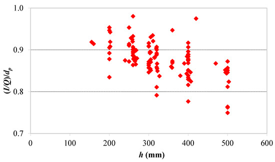 The results of this study showed that the web shear capacity calculations of the ACI 318 [10], as given by Equation (8), for HCS were unconservative for deeper sections. In contrast, the calculations of the ACI 318 [19], as given by Equation (9), appeared to be uneconomically conservative for deeper sections due to the reduction factor introduced in Equation (9). In a previous study [18], the authors explained the cause of unconservative predictions resulting from Equation (8) for deeper sections of HCS. This is because Equation (8) uses the term bwdp, representing the sheared area of the cross-section of the slab, instead of the term Ibw/Q. Web shear cracking generally occurs at the end regions of HCS where the slab is still uncracked in flexure. Therefore, the use of the term bwdp is not accurate. To show the difference between the two terms, the ratio of (I/Q)/dp was plotted in Figure 11 against the thickness, h, of the slabs in the database. The figure shows that the ratio of (I/Q)/dp decreased with the increase in h. This ratio for shallow sections was around 0.9, while it decreased up to 0.75 for deeper sections. This means that Equation (8) overestimates the web shear capacity by up to 33% for deeper sections. To account for this finding, Equation (8) is proposed to be modified by introducing a size effect factor k [18], as follows: