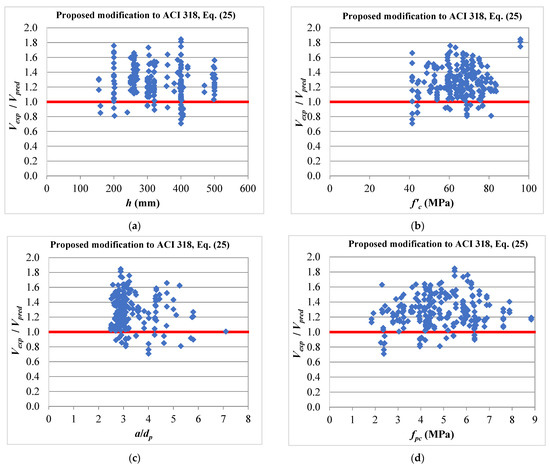 Predictions of Equation (25) against (a) total thickness, (b) concrete compressive strength, (c) shear span to depth ratio, and (d) compressive stress due to the fully effective prestressing force.