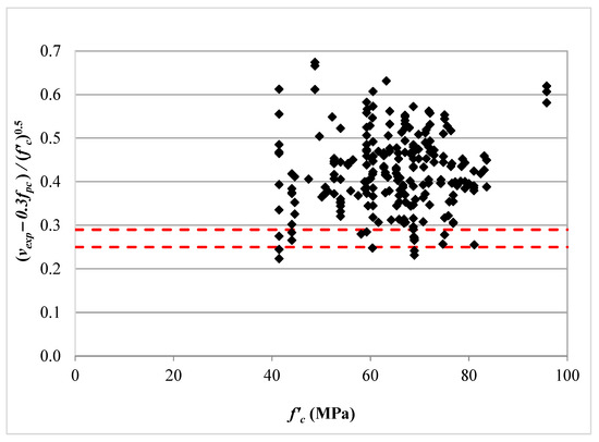 To verify this modification, Equation (25) was used to predict the web shear strength of the HCS in the database. A comparison between the predicted shear strength and experimental ones is given in Table 3 and presented in Figure 12. It can be seen in Figure 12a that the predictions for deeper sections improved and their accuracy became independent of h. The average ratio of Vexp/Vpred was 1.27 with a COV of 17% and the percentage of unconservative predictions was 10%. It may be argued that this percentage of unconservative predictions is larger than the percentage of 5% known to be accepted as an upper limit for design equations. To further modify the ACI 318 method [10,19], the term (vexp—0.3fpc)/(f’c)0.5 was plotted in Figure 13 against f’c for the HCS in the database, where vexp is the experimental shear stress at failure calculated as VexpQ/(bwI). Figure 13 shows that the tensile strength of concrete at the occurrence of web shear cracking for slabs of unconservative predictions by Equation (25) ranged between and . Therefore, Equation (25) can be further modified by replacing the tensile strength of the concrete value of with as an average value for the values of slabs with unconservative predictions, as follows: