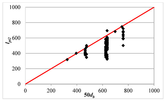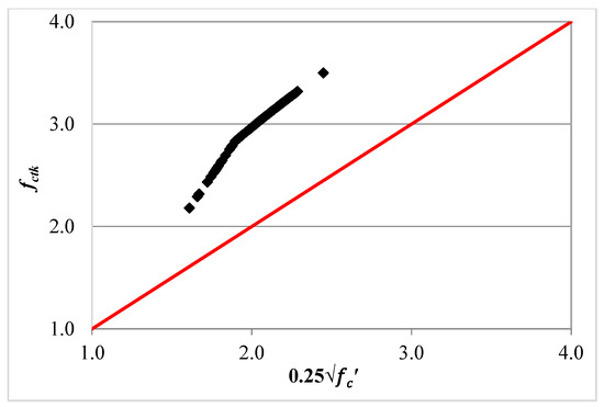 The results of this evaluation indicated that the Eurocode 2 [20] method provided unconservative predictions for the web shear resistance of 56% of the slabs in the database. Unlike the ACI 318 method [10,19], the Eurocode 2 [20] design equation, Equation (10), uses the right term Ibw/Q for the sheared area of the cross-section of HCS. Therefore, the poor performance of Equation (10) may be related to the way that the concrete tensile strength, as well as the transfer length, are calculated. To investigate these possible causes, the design tensile strength of the concrete fctd used in Equation (10) was calculated for the slabs in the database and plotted in Figure 15 against the lower bound tensile strength of the concrete determined in the preceding section. It should be confirmed again that the partial safety factor γc in Equation (11) was set equal to 1.0 and fctd was turned to be fctk. Figure 15 clearly shows that the calculated fctk was higher than for all slabs. The average ratio of was calculated for all slabs and found to be 1.46. This suggests that a reduction factor of 1/1.46 = 0.68 is to be introduced with fctd into Equation (10). Similarly, the transfer length of prestressing strands, lpt2, used for calculating the factor αl in Equation (10) was calculated for all slabs and plotted in Figure 16 against the transfer length corresponding to 50db. This value of transfer length was chosen as it represents an average value between two different studies [4,12] for measuring the transfer length of prestressing strands in HCS. The experimental measurements of Walraven and Mercx [4] indicated that the transfer length of prestressing strands was less than 50db, while the opposite was obtained by Palmer and Schultz [12]. Figure 16 shows that the calculated transfer length lpt2 of Equation (15) is less than 50db. The average ratio of lpt2/50db was calculated for all slabs and was found to be 0.8. This reduction factor is also introduced into Equation (10) with the factor αl. The proposed modification of Equation (10) is given as follows: