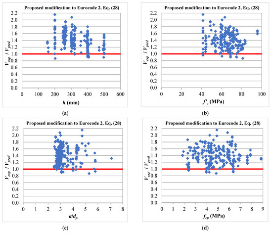 Predictions of Equation (28) against (a) total thickness, (b) concrete compressive strength, (c) shear span to depth ratio, and (d) compressive stress due to the fully effective prestressing force.