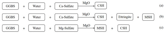 - Jin, F.; Gu, K.; Abdollahzadeh, A.; Al-Tabbaa, A. Effects of Different Reactive MgOs on the Hydration of MgO-Activated GGBS Paste. J. Mater. Civ. Eng. 2015, 27, B4014001. [Google Scholar] [CrossRef]
