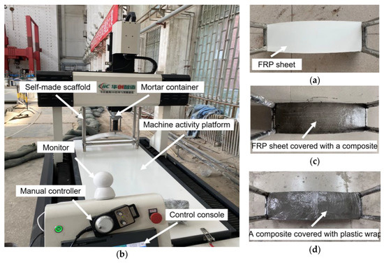Figure 2 depicts the fabrication process of a 3DPC thin-shell structure. First, the short edges of FRP sheet made according to the design curvature were fixed on the self-made scaffold (Figure 2a). Then, the materials prepared according to the mixture ratio were poured into the mixer. After being evenly mixed, the composite mortar was placed in the container of 3D printer HC 1009 (Figure 2b), which is purchased from Huachuang Zhizao Co., Ltd. In the city of Tianjin, China. A large number of studies on materials and printing processes included in product manuals have been carried out by the company. Attention was given to the settings of printing parameters. The horizontal printing speed of the 3D printer was set as 50 mm/s and interlayer interval time was designed as 60 s. Each layer height of 5 mm was adopted, so the machine was designed to move up in 5 mm intervals. Finally, the fiber cement composite was repeatedly extruded along the length direction of thin-shell structure through 10 mm nozzle to cover the FRP sheet (Figure 2c). Note that the excess composite mortar was scraped off along each side of the bottom plate. After being covered with plastic wrap (Figure 2d), specimens were stored for 7 days in the standard curing room. Differing from the traditional composite structure, the preparation process does not require any adhesive. The fiber cement layer and FRP sheet will naturally bond together during the fiber-reinforced cement materials setting process.