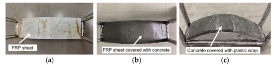 The bottom layer of the 2 mm FRP sheet can be directly purchased from the manufacturer, which consists of 70% bidirectional glass fiber wrapped in polypropylene resin. The material properties are shown in Table 2. In addition to light weight and low cost, it also has high durability and fatigue resistance [8], as well as maintenance and bearing capacity. It is more convenient for transportation and construction due to a prefabricated board. Additionally, there is no need for any binder in the preparation process. This is because the fiber-reinforced mortar material has good viscosity, and the bonding force generated in the setting process will make the upper and lower layers closely bonded, thus forming an integrated thin-shell structure [19].