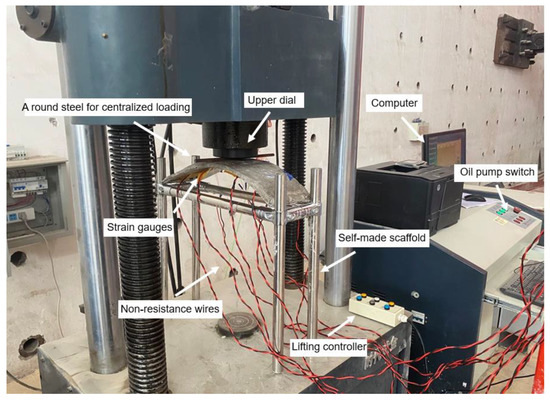 Based on ASTM-C393-00 [20], line loading tests on both 3DPC thin-shell structure and traditional concrete structure were carried out through a Micro Servo-Hydraulic Universal Testing Machine with a maximum load capacity of 300 kN. Three samples were tested for each testing series. As shown in Figure 5, the width directions of the thin-shell structure were fixed at both ends of the self-made scaffold, and the mid-span position was directly under the geometric center of the lower piston. To better realize the line loading test while ensuring the accuracy of test results, a round steel bar with a diameter of 1 cm was customized. Before tests, the pressure-bearing round steel was compacted by the upper dial compact and the interface was coated with a certain amount of lubricant. Thin structures were loaded from 0 kN and a fixed rate of 2 mm/min was set until failure of samples.